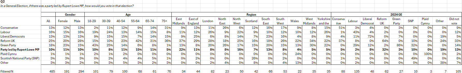 Restore Britain commissioned a poll on voting intention, including a party led by Rupert Lowe MP.
