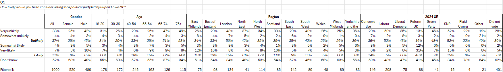 How likely would you be to consider voting for a political party led by Rupert Lowe MP?